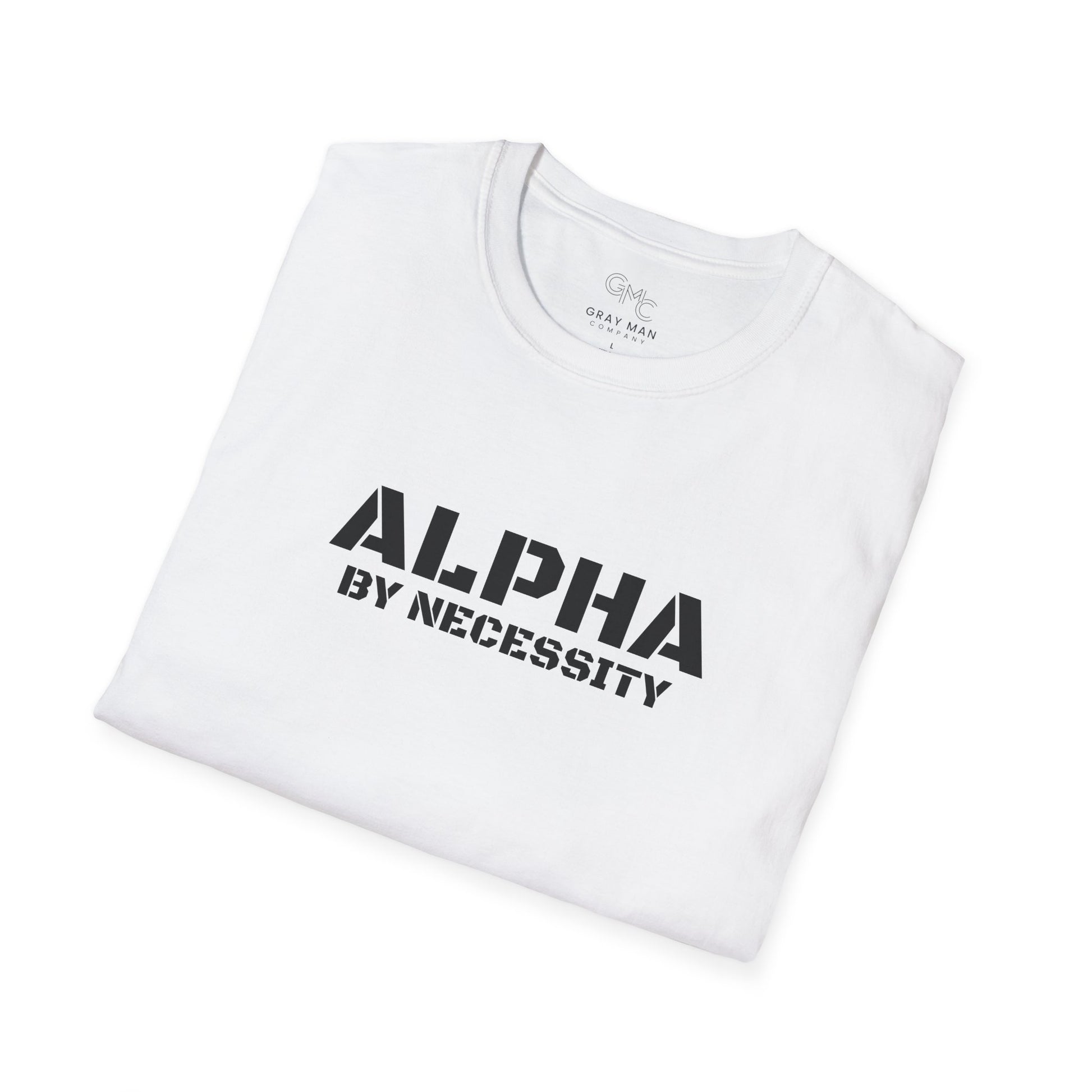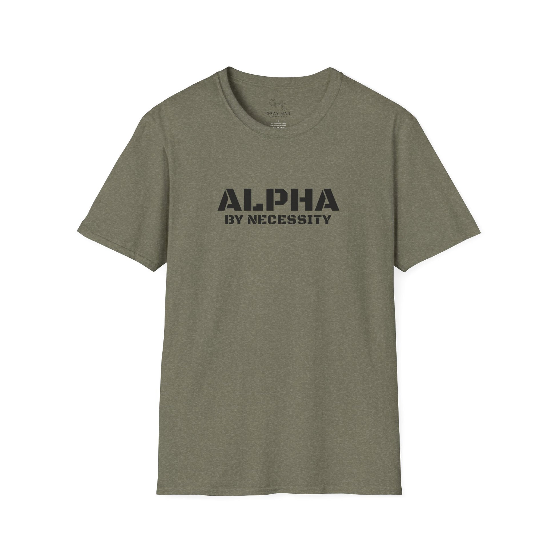 The front proudly displays "ALPHA BY NECESSITY" alongside the iconic Gray Man Company logo, symbolizing your readiness to take charge when it matters most. This shirt is more than just apparel; it’s a badge of honor for those who lead with confidence and strength out of necessity.