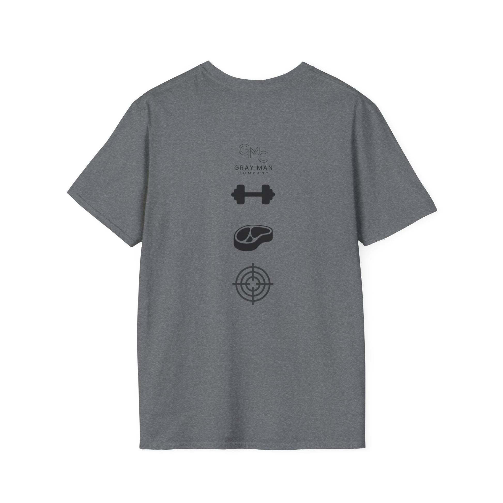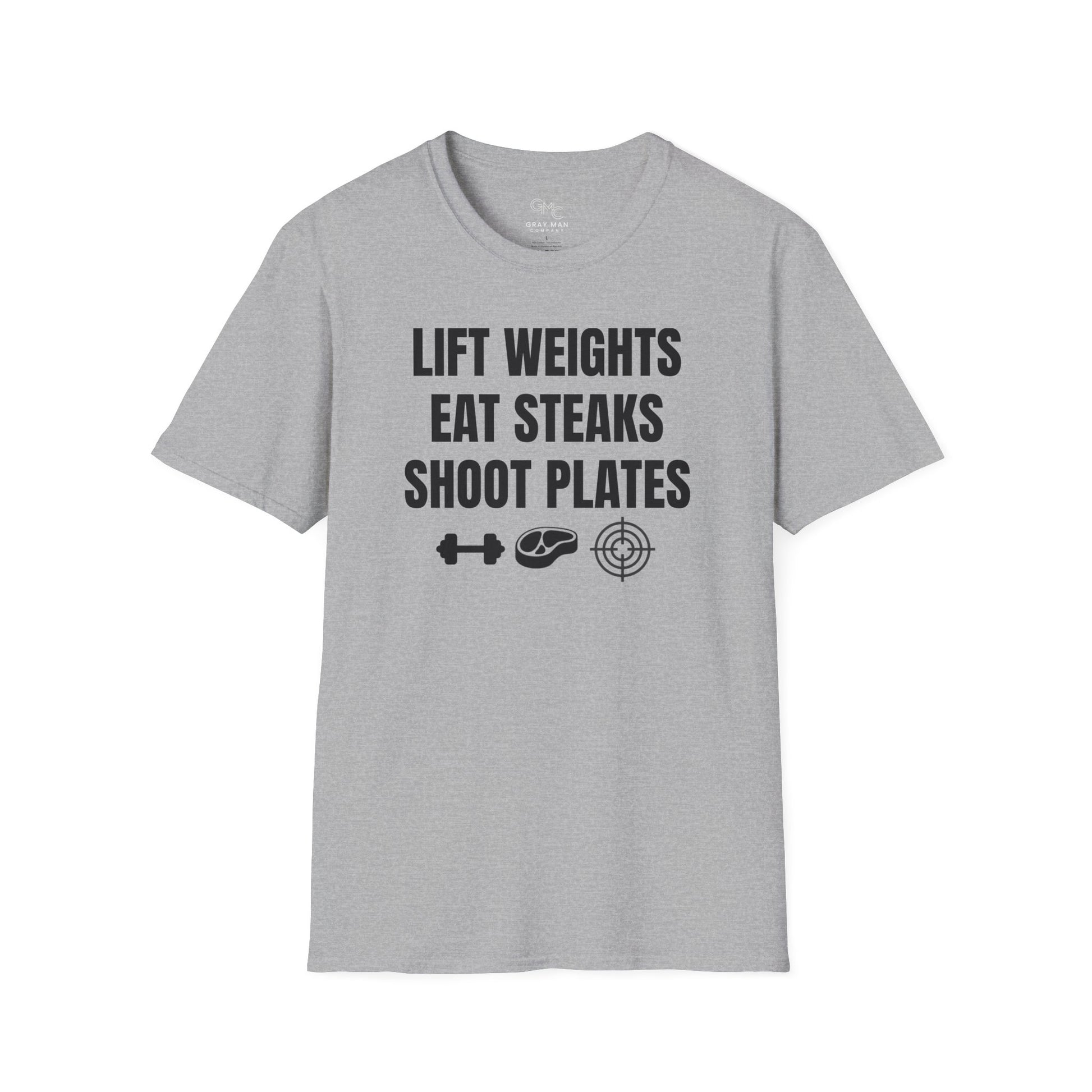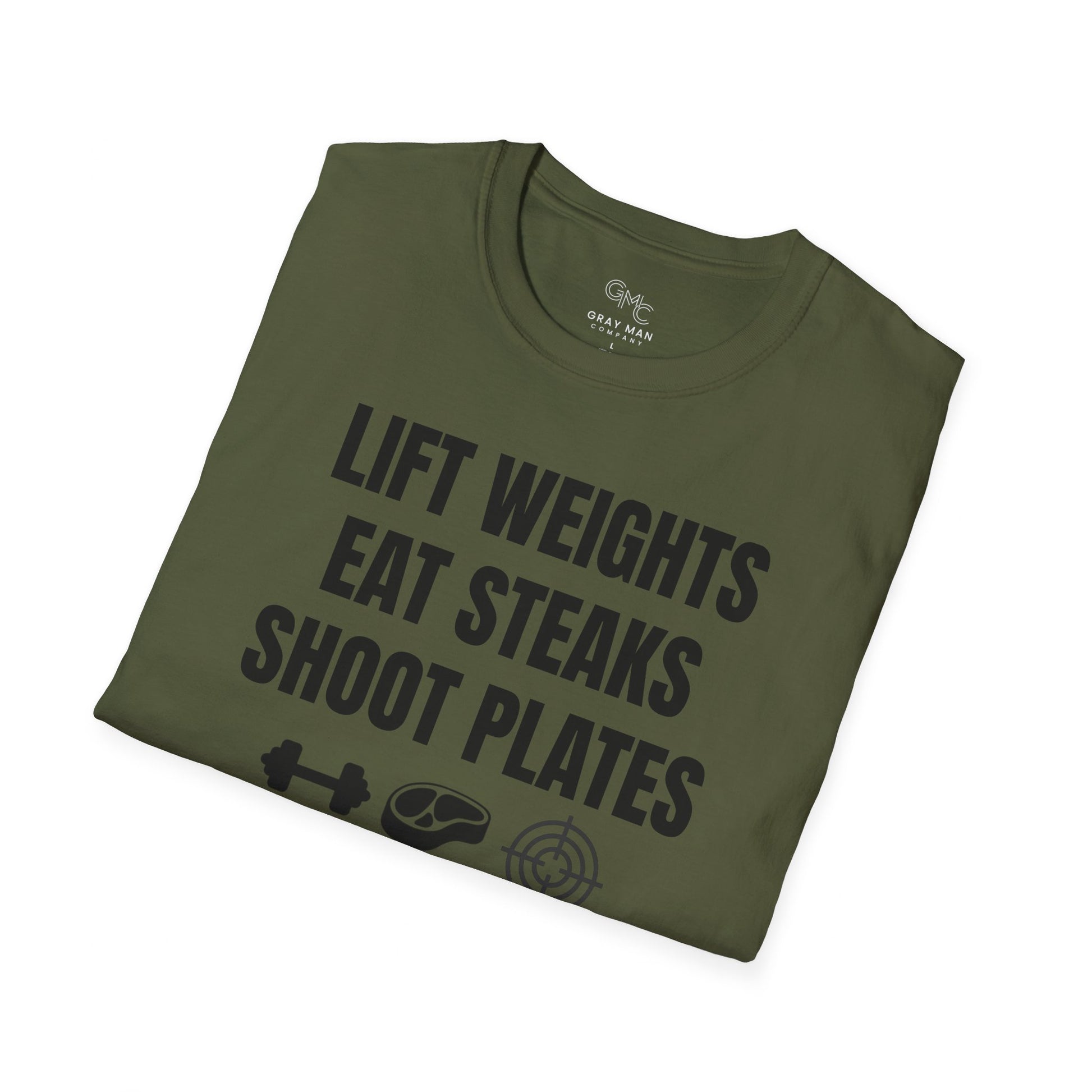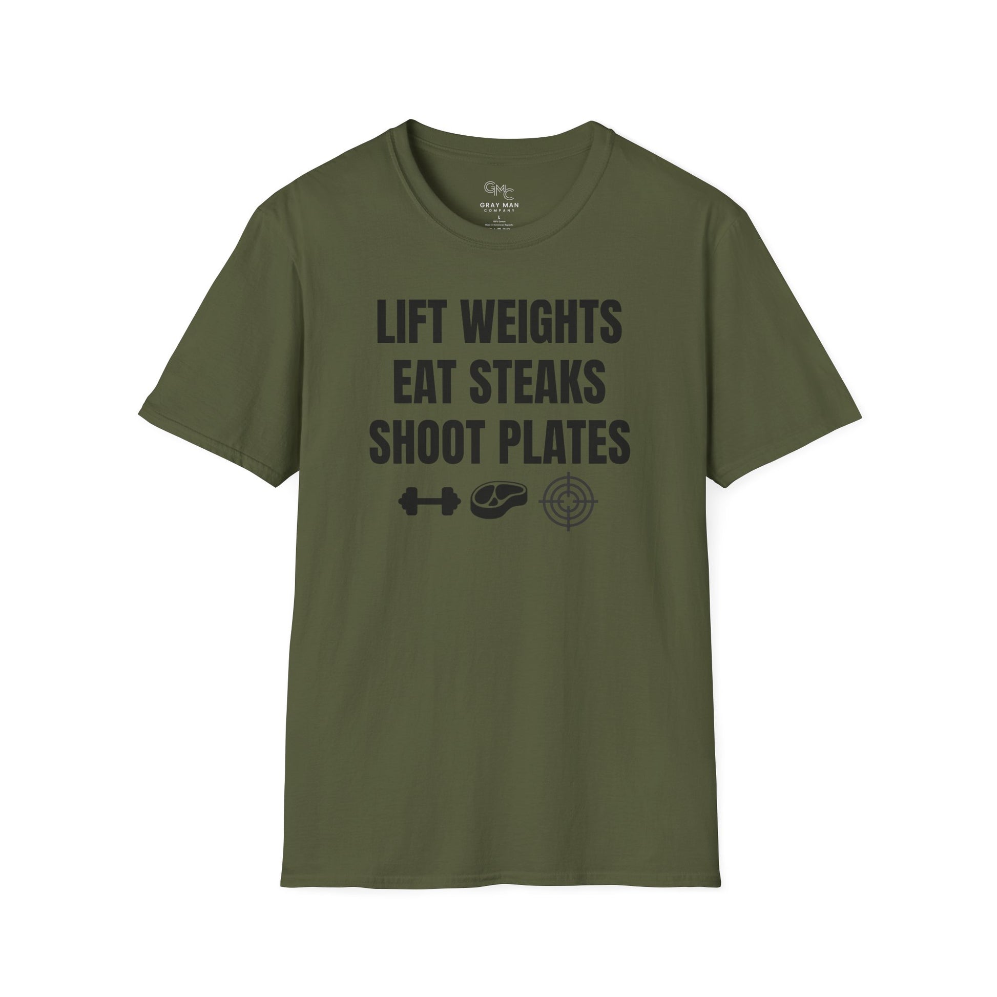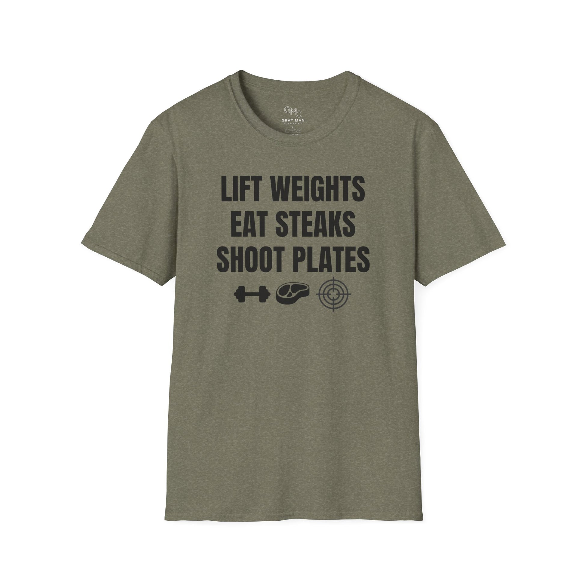 Gray Man Company EDC Graphic T-Shirt - LIFT WEIGHTS, EAT STEAKS, SHOOT PLATES