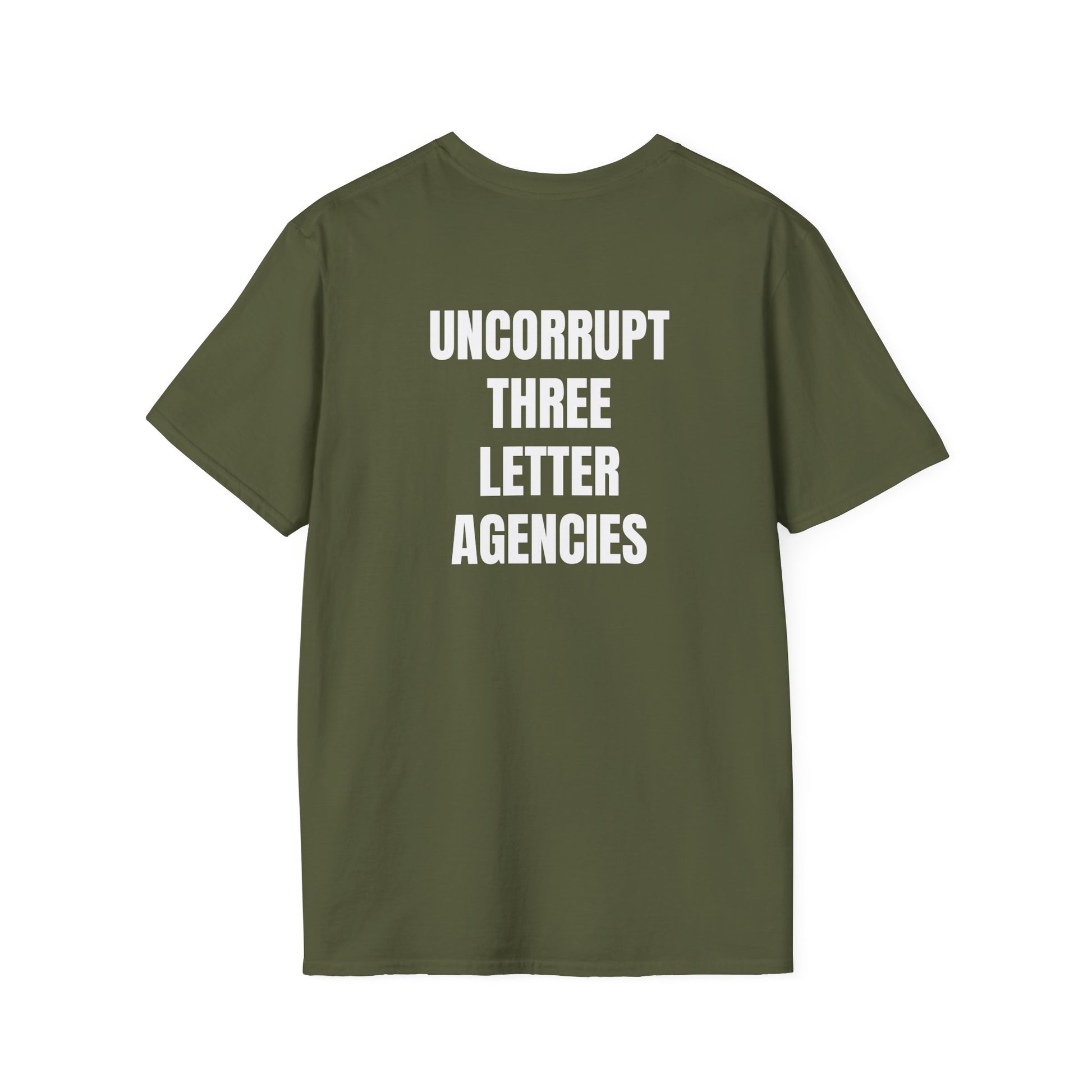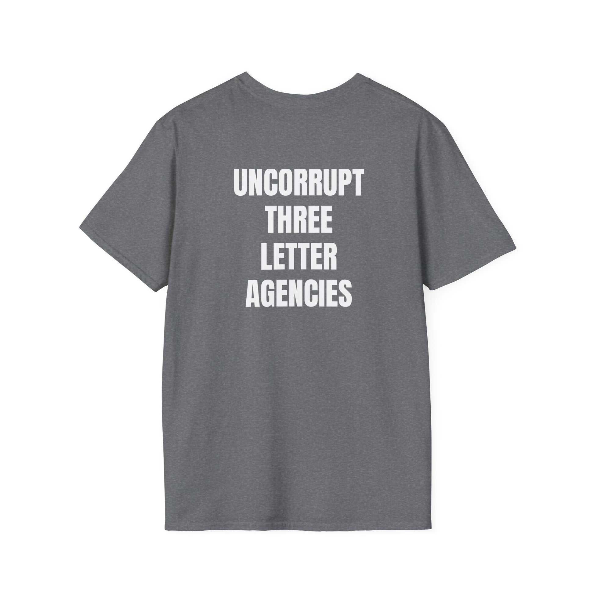 -Powerful Message: The front graphic reads "UNCORRUPT THREE LETTER AGENCIES," emphasizing the need for honesty and reform in our most trusted institutions.